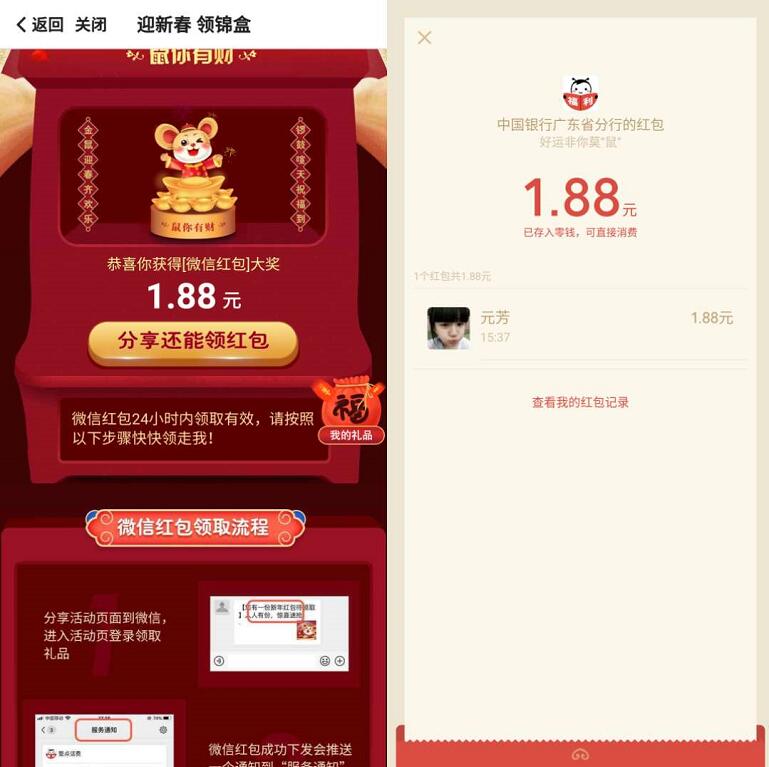 正文 广东中国银行迎新春领锦盒1分钱抽1.88元微信红包 管理员 V管理员/ 2020年/ 0 评论 0215 活动介绍活动期间参与广东中国银行迎新春领锦盒的活动,扫描二维码或者活动链接,进入活动页面,广东中国银行打开礼盒,中国银行支付1分钱即可抽奖1.88元微信红包,亲测秒到,小钻吧的网友快去参与吧(扫描文末二维码,可加小编微信查看朋友圈最新红包活动)结束时间:2月29日活动奖励:1.88元微信红包立减参与长按二维码微信扫描二维码失效可联系我更新长按识别二维码进入活动页面: 文章版权声明:除非注明,否则均为小钻吧原创文章,转载或复制请以超链接形式并注明出处。