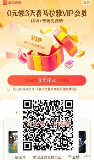 活动期间参与喜马拉雅7天会员限时领海量好书免费畅听的活动,京东Plus会员免费领7天喜马拉雅会员->领取成功后按照页面兑换!,小钻吧的网友快去参与吧(扫描文末二维码,可加小编微信查看朋友圈最新红包活动)